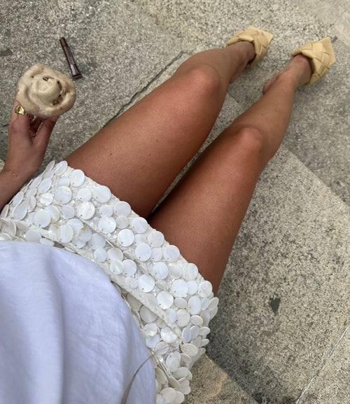 The Mercer Mini skirt is finished with cascades of light catching sequins and adorned all over with hundreds of oversized pearlescent shell beading. Hand-embellished by highly skilled artisans, this style is a timeless, one of a kind masterpiece.