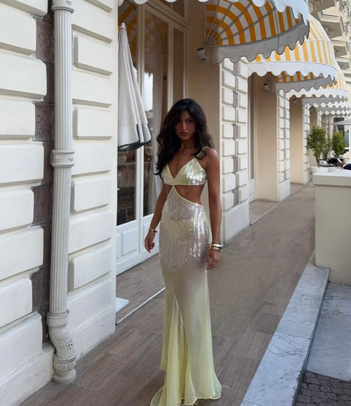Strategically placed midriff cut-outs sculpt the silhouette, whilst an overlay of oversized transparent sequins catch the light with every movement. Delicate, adjustable thin straps frame the shoulders, allowing for a perfectly customized fit, while a discreet bra clasp fastening at the back adds an intimate, lingerie-inspired detail.